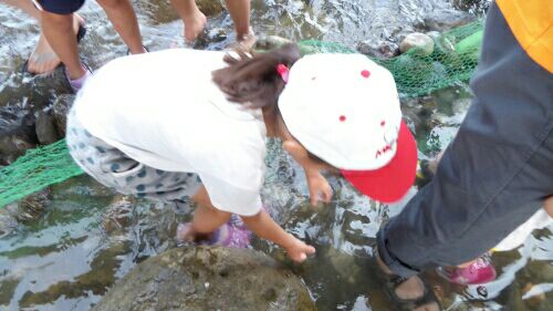 とにかく日差しが強い まずは川にいる生き物の観察 いわゆるオケラを生まれて初めて見た