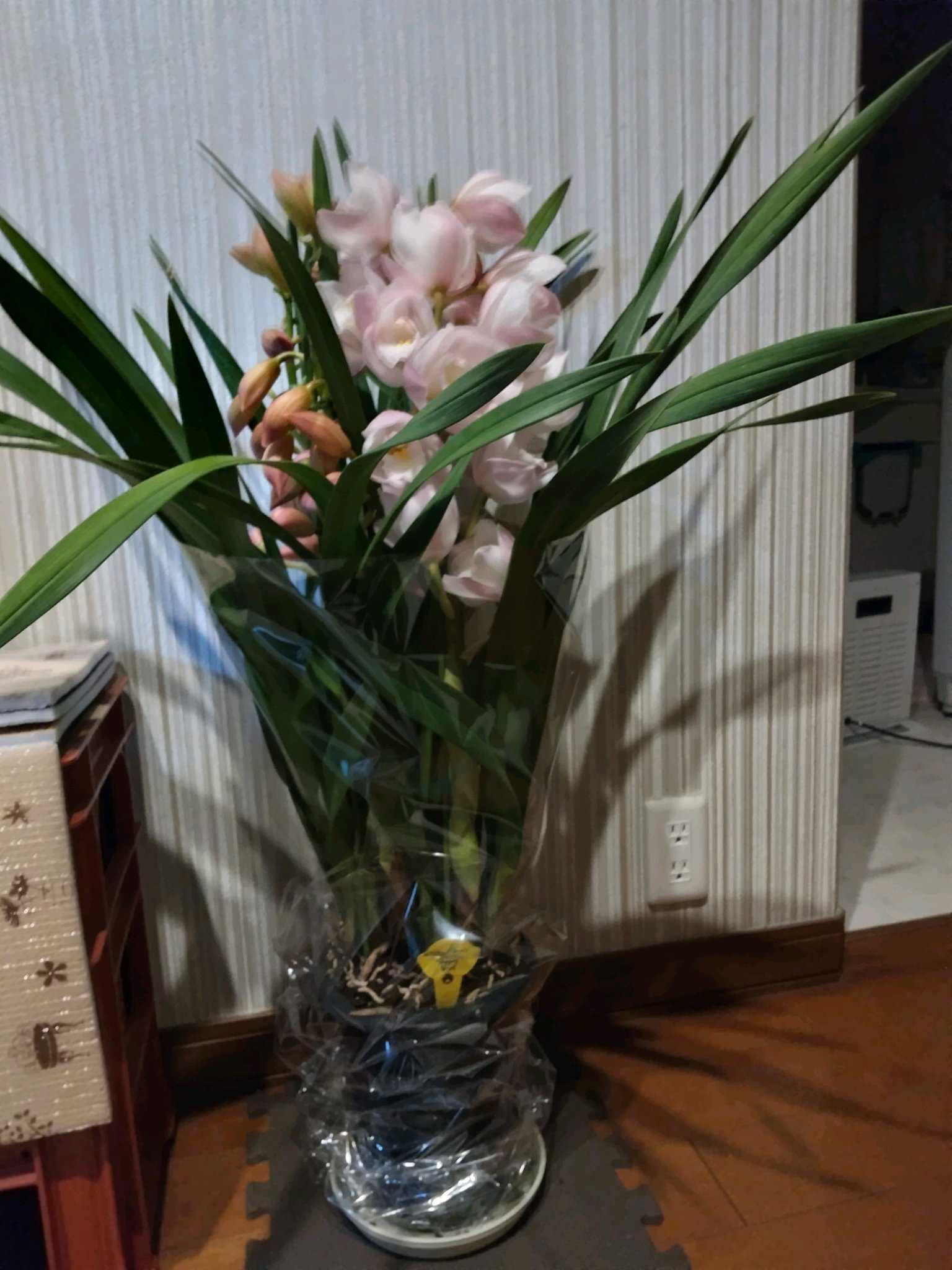 色は淡いピンクで4本立ちですが花が咲いているのは1本のみで残りの3本には蕾がたくさんついています。この状態なら来年の4月まで咲き続けると思います。咲き終わった後の管理とお手入れは私の担当です。