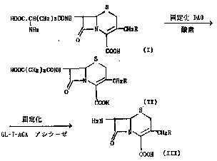 出願番号 : 特許出願平3-354448 出願日 : 1991年12月20日 公開番号 : 特許公開平5-211890 公開日 : 1993年8月24日 出願人 : アンティビオティコス ソシエタ ペル アチオニ 発明者 : ステファノ カムビアギ 外2名 発明の名称 : 7-アミノセファロスポラン酸及び誘導体の酵素調製法 【構成】 図示反応式で示されるように、固体マトリックスに固定化された酵素を使用する酵素二段階法によるセファロスポリンC(I)またはその誘導体及び塩から7-アミノセファロスポラン酸またはその誘導体(III)への変換法。(式中、Rは-OCOCH3,-H,-OH,-OCONH2、DAOはロドトルラ・グラシリスATCC26217培養菌から得られた酵素D-アミノ酸オキシダーゼである)。【効果】 7-アミノセファロスポラン酸及びその誘導体を高収率、高選択率で製造できる。出願番号 : 特許出願平4-198363 出願日 : 1992年7月24日 公開番号 : 特許公開平5-211889 公開日 : 1993年8月24日 出願人 : ミニステロ デル ウニヴェルシータ エ デルラリチェルカ シエンティフィーカ エ テクノロジカ 発明者 : エツィーオ バッティステル 外3名 発明の名称 : 7-アミノ-セファロスポラン酸の酵素的製造法 【構成】 式(II)【化1】〔R:H、OH、 O-CO-R″;R″:(C1 ~C4 )アルキル基;R1 :カルボン酸基〕をもつ化合物をシュードモナス(Pseudomonas)、バシラス(Bacillus) 、アクロモバクター(Achromobacter)属から選ばれる微生物又はそれらに由来する酵素の存在下に選択的脱アシルして式(I)【化2】をもつ7-アミノ-セファロスポラン酸を製造する。【効果】 この方法は高選択性、高アシラーゼ活性の微生物を用い、毒性の溶媒又は試薬を必要とせず、穏やかなpH及び温で行なわれる。