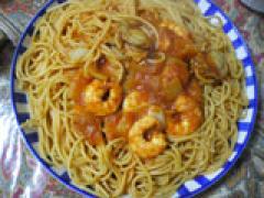 鶏肉のトマト煮を使った、シーフードパスタを作ってみました。