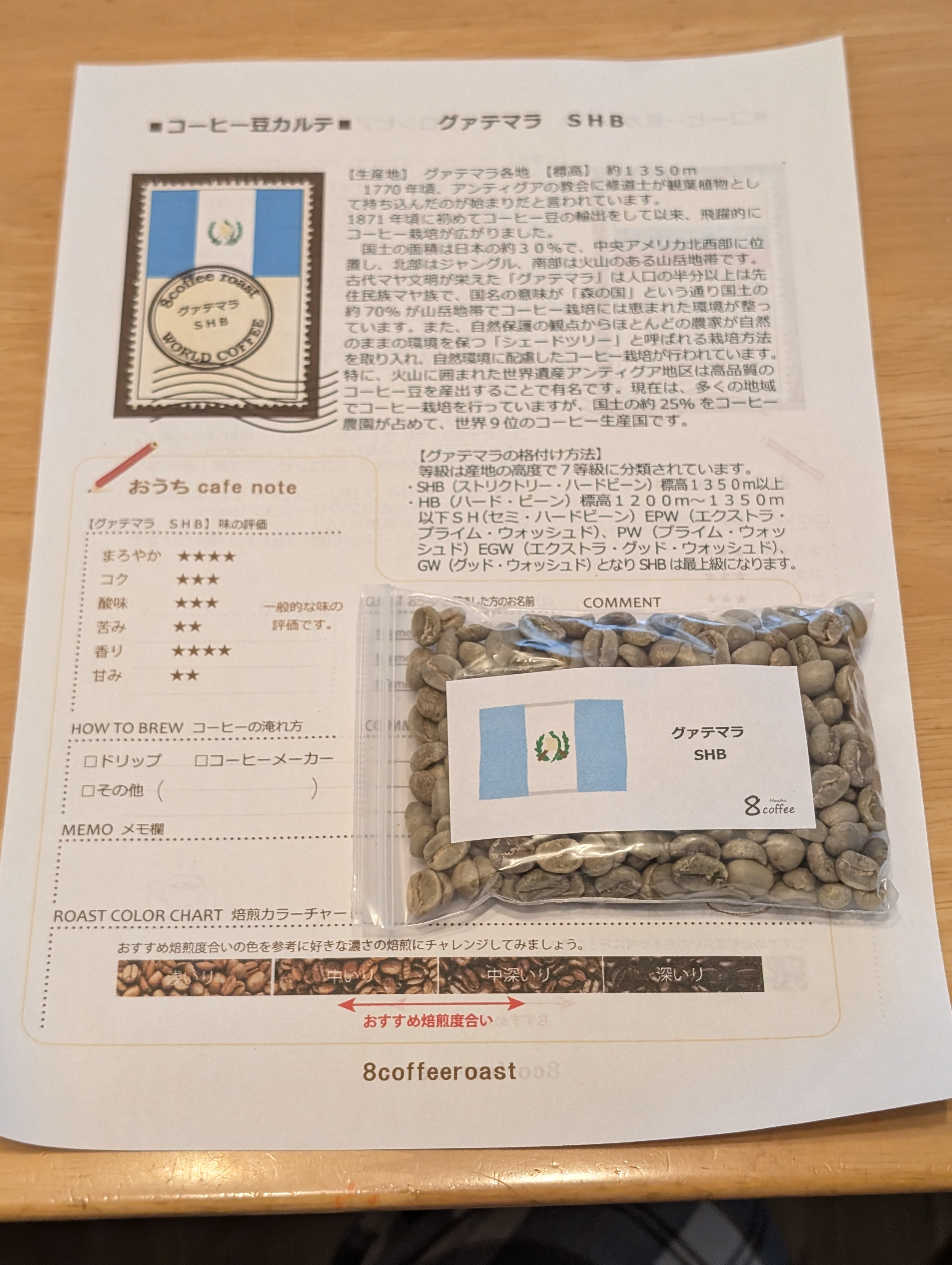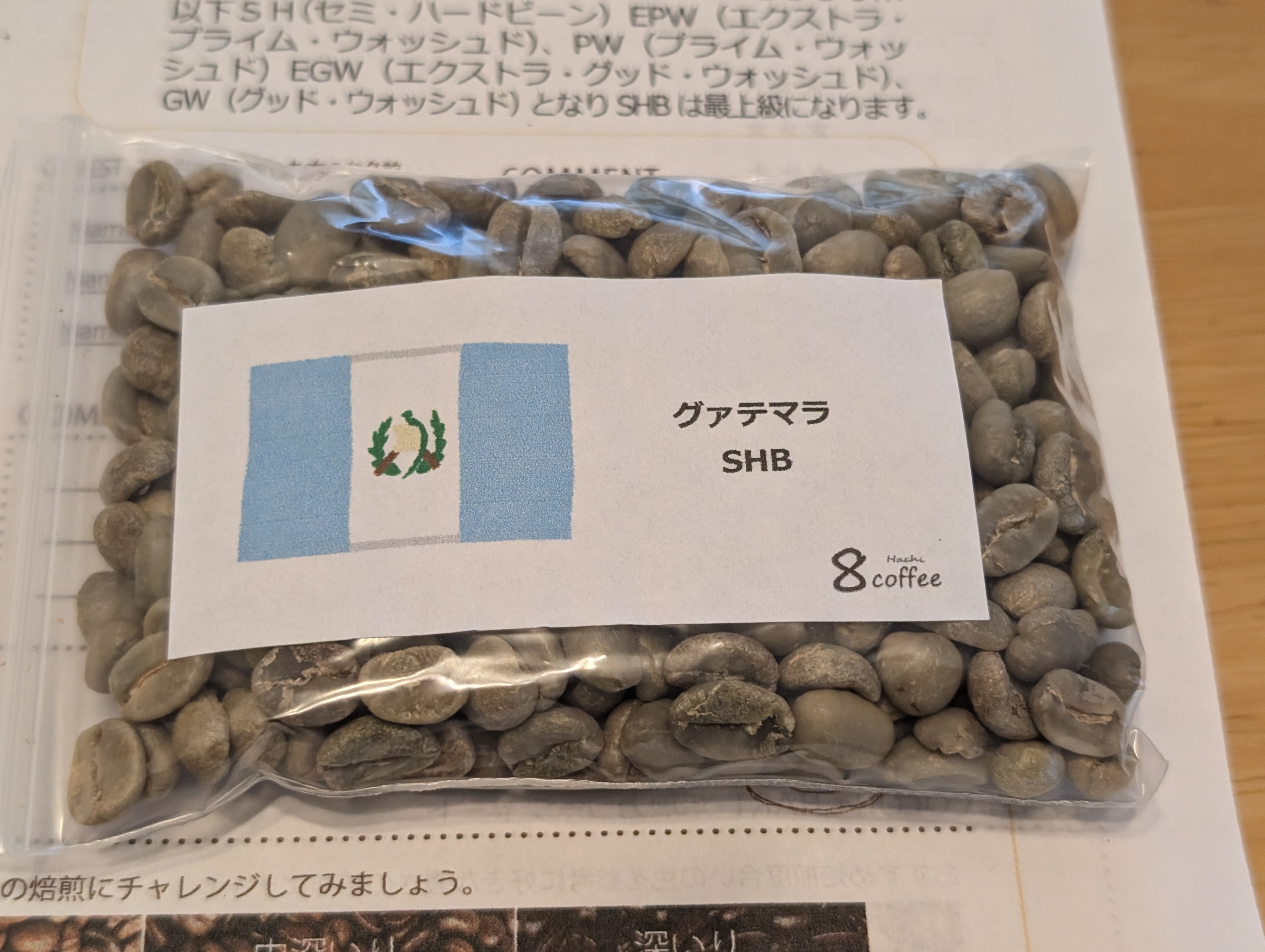 生豆は比較的安く手に入るのが魅力的です。今回は「8COFFEE」というところから購入した「グァテマラSHB」という豆を使いました。