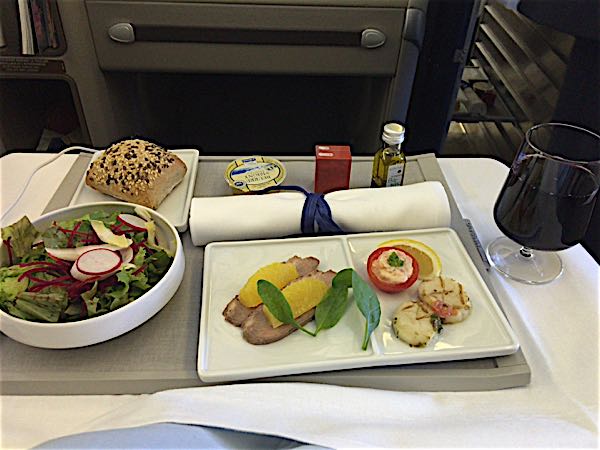 前菜やで。成田ーパリ エールフランスその2 お料理はいたって普通。 ウマからず不味からず。 機内食はJALだなぁ。 ニュージーランド航空もう味落ちちゃったしなぁ アナはあまりうまいって感じたことないぞー デルタ航空がアメリカのエアラインだけあってちょっとオオアジ エミレーツは言うに及ばず……。 そう考えたらやはりエールフランスの機内色は私が乗った飛行機会社の中ではベストスリーに入るかもしんないなぁ。 カタール空港のスモークサーモンがすごいおいしかったなぁ。 ヴァージンアトランティックはまずかった記憶がある。1番感動したのはまだロシアがソ連だった頃、アエロフロートがとても安くてファーストクラスに乗ったんだその時帰る飛行機がなくて。その時ブリニ言うそば粉のクレープにキャビアたくさん出せる食べさせてくれたんだけどあれはうまかった。 でも最近のJALに勝るものなし。 メインどすえ 本場のチーズだもん。 松屋銀座地下のチーズより美味しい ブレックファーストやさかい〜〜