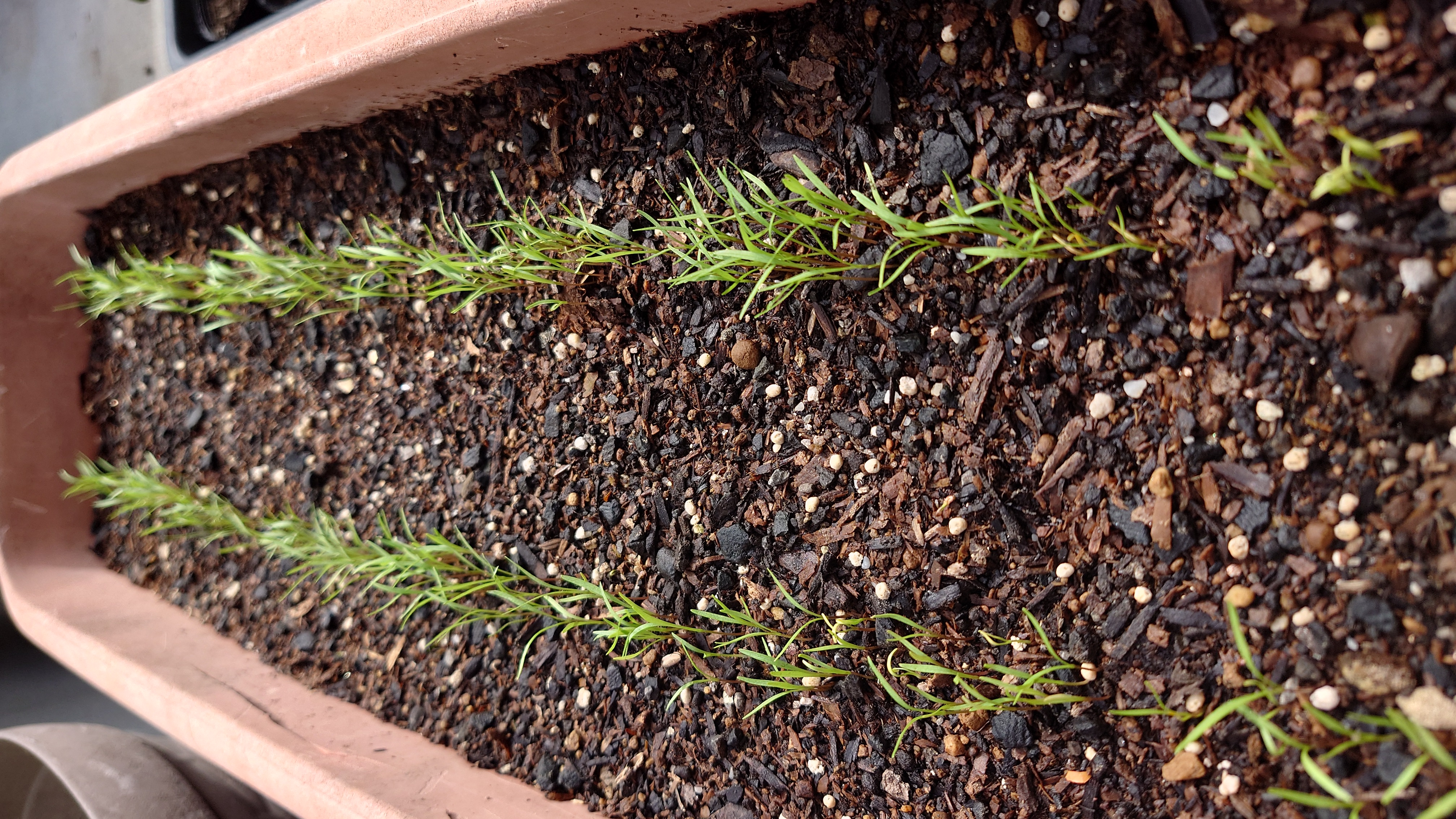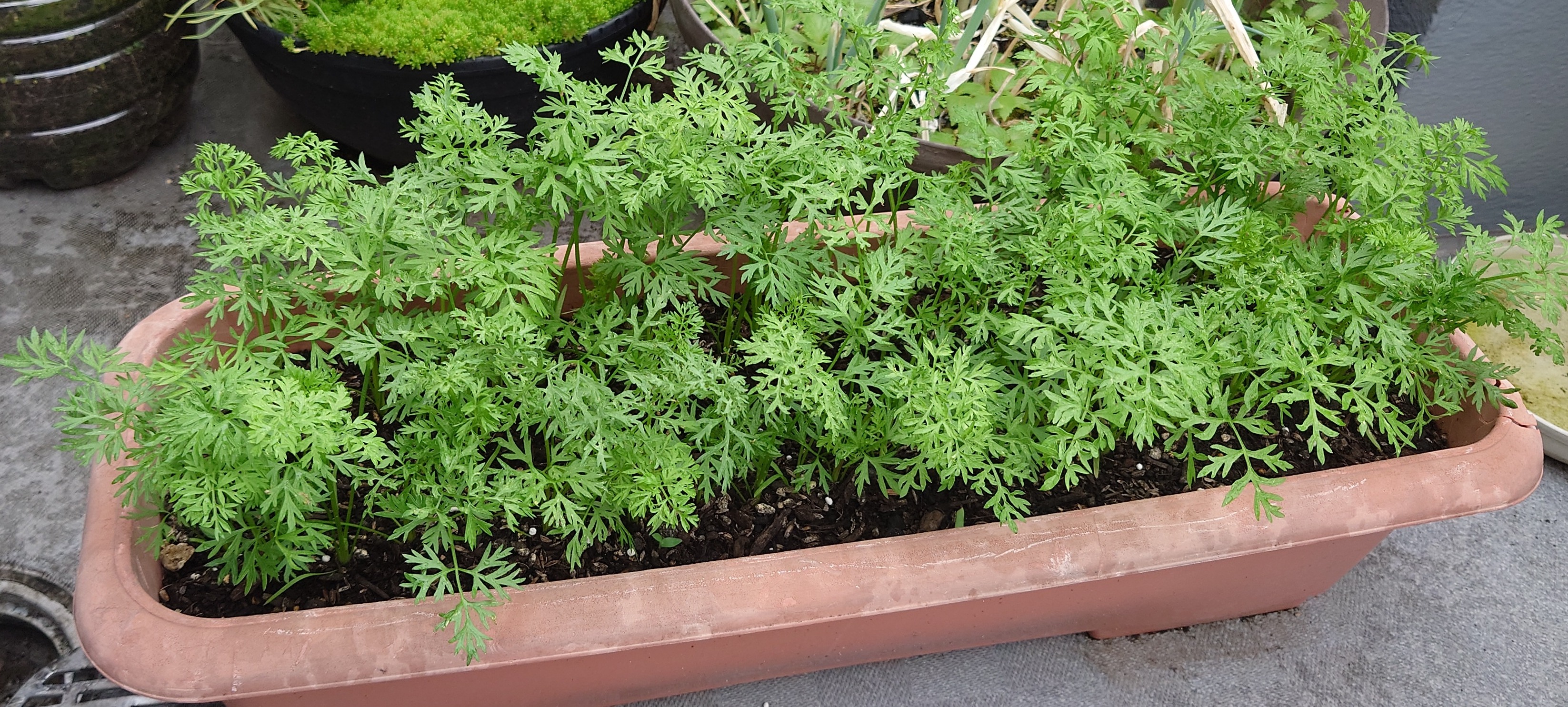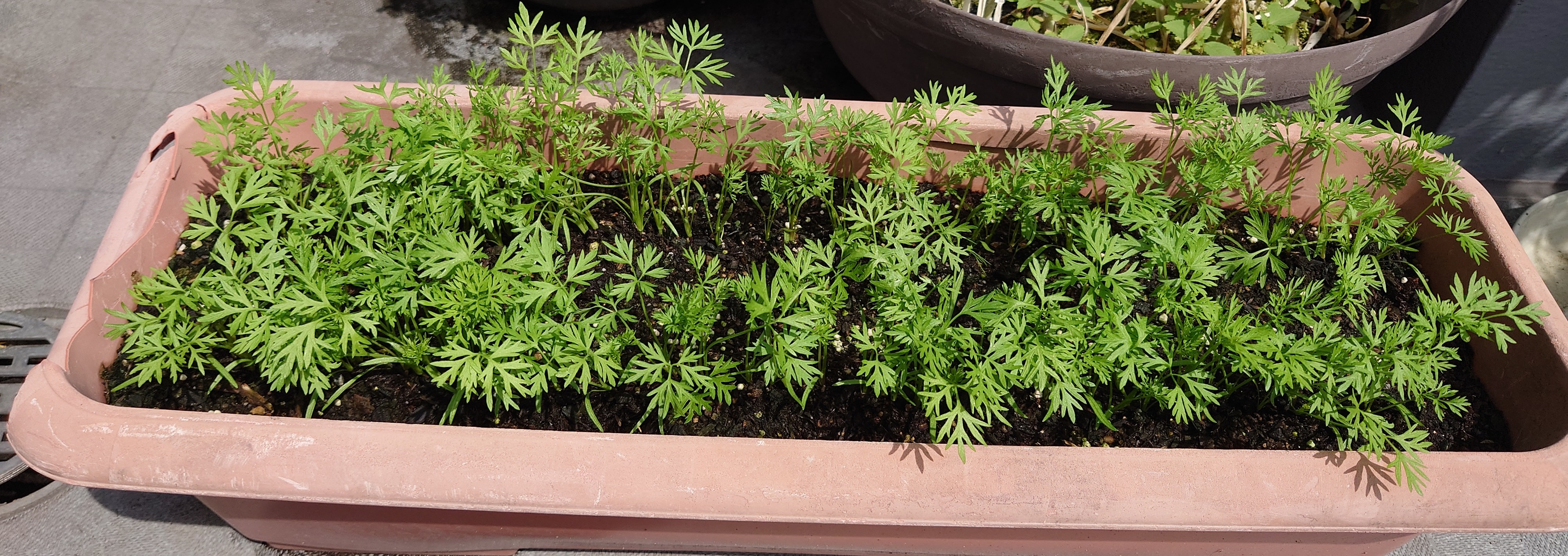 2週間後人参らしい葉が!間引きサラダで葉っぱは食べました。