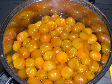 ここ数年気管支が弱くなった。風邪をひくと数カ月咳が続くのだ。内科では「風邪ぜんそく」と言われた。わたしは親方の喫煙が原因の一つとにらんでいる。気管支炎にはキンカンが効く。昨年はばぁばのキンカンをおすそ分けしてもらった。今年は自分で煮てみた。湯引きしてから砂糖で煮る。3時間が経過した。ドロドロのキンカンエキスが甘く染み出る。三温糖のつややかな感じが食欲をそそる。分量は適当だが自分の味見に勝る配当はない。実際ばぁばもレシピはない、という。「これでいいだよ」ばぁばが指を舐めて味見をするまねをした。キンカンエキスはフツフツとわたしを誘う。なめて~なめて~と、言っている。食パンがあったのでジャムのようにエキスを塗った。トロリとみえたが、エキスは瞬時にパンに沁み込む。真っ白な食パンが俄かに色がかるといよいよ胃がうなる。少し大ぶりではあったが「ハッフッ」と頬ばった。酸味と甘みが味濃く、脳を刺激する。わたしの好物は“炭水化物”だ、今なら迷わず答えることだろう。脳を刺激した炭水化物は口の中をまったりと幸せにして喉をつたる。胃袋に収まるころには、2つ目の味見が始まっている。こうして何回か味見が繰り返される。キンカンも2~3個口内に啜りいれる。歯ごたえと言うより舌ごたえは大変よろしい。舌で身を潰すと中身がドロリと飛び出る。やがて種の一粒一粒が舌べらで感じるようになると、味見は終盤に差し掛かる。夕ご飯前に味見だけでお腹いっぱいになってしまった。このような調子では体脂肪は減る様子もない。気管支炎の薬なのだ、と身勝手な判断で今回は食事ではなく薬に分類した。