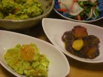 柚子風呂は勿論、欠かせない食べ物として冬至南瓜も。餡子屋さんの小豆と南瓜を煮たものに残っていた栗の甘露煮のシロップと栗が入れてありました。小豆あんは苦手なので一口でしたが お寿司屋さんで食べて美味しかった南瓜とヌタの和え物、今回はアボカドとクリームチーズをたっぷり目に作ったようです。お腹の丈夫な両親向きの繊維質とクリームチーズたっぷり和え物 作っている途中に面白いと撮影部隊として参加。手前1から枝豆のヌタとクリームチーズ、真ん中2がアボカド、奥が1と2を混ぜた物。ど~れも同じ色。ただそれだけですが。。。 そういえば教室の生徒さんから聞いた酒粕の甘酒、ここんところ柚子を浮かべて頂いてます。便秘に酒粕の甘酒がヨロシイとのことですが、ワタクシ☆必要性はないものの・・・。