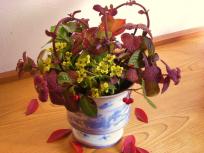 我が家の庭をひと回り皆さんのブログでお庭の様子や季節を感じてばかりいましたが、ほぉ~我が家の庭もそれなりに季節感たっぷりと増え過ぎて困るミントも今の季節、寒さでしもやけ状態〔?〕その色がいい。チョコレート色の地下茎もいい。そしてブルーベリーの葉の紅葉も拾ってきた。まだ黄色い花を咲かせていたハーブ、ルー〔別名ヘンルーダ〕も摘んだ。 盃洗を花器にして活けてみた。う~ん、季節柄赤い実が欲しいとヤブコウジをプラスしてみた。只今、親不知なんか育てたりしてます。いったい、いつの間に顔を出したのか!一生 生えないだろう~なんて言われてたのに、な~んの痛みも違和感もなく!多分、最強の痛み止めを服用しているので痛みすら感じず顔を出し始めたのかもしれません。丁寧に歯を磨いても奥の奥だし結局は抜歯する運命なのかなぁ~と思いながら成長を見守ってますが、歯医者さんかぁ~~~ ボリジの群生地!こぼれ種で来春開花の為に育っている☆ボリジ、ぱっと見にホウレンソウでも生えているように見えますが、間違いなくキュウリの香りのする葉っぱ☆ボリジ。ここに足を踏み入れてミントを摘みに行ったら、帰り☆ボリジを踏まないように気を付けてみたものの、重い雪の下で越冬するだけに少々・・・すみません ☆ワタクシの重みが雪よりも先に・・・すみません。