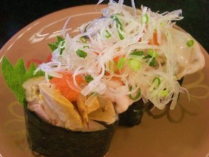 いつもご訪問、コメントありがとうございますエビ、カニアレルギーで人生で損してると言われ続けてますが、いつも行くお寿司屋さんでは損してるなんてことも忘れさせてくれる。テイクアウトの お寿司にも配慮してくれるし、目の前で空回りの回るお寿司屋さんです。暇なお店では無いんですが何時でも握り立て特大ヤリイカ、シャリ2個 315円、皆さんオーダーするもんだから一度は~と丸ごと焼き穴子、目の前でバーナーでジュー、トロッとウンマイっ シャリ2個隠れて420円。一気に穴子好きになるくらい次は焼き穴子3本のった丼800円(?)をテイクアウトと決めて、いつものアレルギー除去 生寿司を持ち帰る。アレルギーのエビ、カニなど この世に存在などしないと忘れてしまう お店です。最近やたらと冷凍オムレツが続き、そん次は冷凍ハンバーグが続いて、滋養を付けろというのかラジウム卵、茹で卵と続き、一食に薄めた卵とはいえ茶碗蒸しに卵とじ~なんてメニューが続く宿の料理です