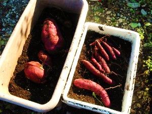 いつもご訪問、コメントありがとうございます第一回目のサツマイモの収穫の時にサツマイモの茎の粕漬けが好評につき蔓の収穫の為に残して置いたプランター菜園のサツマイモ第二回目の収穫は11月中旬小さ目 発泡スチロール容器栽培の多分 なると金時今年最大のサツマイモは紅はるかまだまだ二年目プランター菜園ではありますが昨年、今年の中でも最高記録1.2キロまで育ってました第三回目、今年最終の収穫は1袋半日陰、培養土の袋利用、そもそも定植時期も遅かったサツマイモ親株(ポット苗)から育っていた芽、無駄なく刺し苗として利用肥料分が多いと蔓ぼけ、蔓が茂り芋が育たない状態とは違ったようで蔓はヒョロ~リとスリムで茂ってない状態にしては小さいながら芋が育ってましたいつの間にか大中小80個から100個のプランターになっていたボリジ亭のプランター菜園16個(うち数個は培養土袋利用なので100個に含まず)近くサツマイモを植えていたプランターは空き次第 培養土の入れ替えし玉葱苗の定植その際に掘り残しのサツマイモ見っけっ紫芋か紅はるか、なると金時かはファーマーズマーケットに並んでいたサツマイモの茎1袋150~200円年に一回は旬ともなると購入していたサツマイモの茎今年はプランター菜園の蔓で炒め煮、佃煮、粕漬けに飽食の時代、戦時中のようだと言われそうですが繊維質たっぷり、クセも無く美味しく頂きましたボリジ亭では初チャレンジの粕漬けが人気今では蔓収穫の為の品種もあるんだそうです