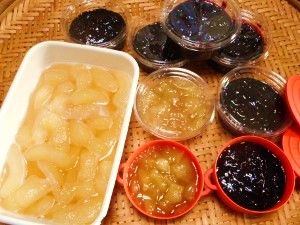 いつもご訪問ありがとうございます冬の教室終了後の勝手にお茶会メニューよりラ・フランスのコンポートとジャムシナモンを加えたジャムにしてみました庭から摘んで冷凍保存しておいたブルーベリー2kgほど残っていたのでジャムにして持参リンゴジャムはシナモン入りと生姜入り ジンジャーシナモンジャム辛味が馴染むよう摩り下ろした新生姜を砂糖で煮て置いた生姜糖ペーストを加えて煮ましたジャム持参ということはハマっていたパン作り ソフトフランスパンを焼いてスライスしたリンゴをミルフィーユ状に詰めて焼くガトーインビジブル生地はホットケーキミックスを使用、沢山のリンゴが詰まってます立派な地物のゴボウを見つけ お節料理前に練習も兼ね筒ゴボウの煮物それがそれがゴボウを見る目がまだまだっ節が多くてなかなか芯が抜けずに苦労しました芯を抜くのに太いゴボウなので短くカットしてよかったようですちなみに教室のオマケの反省点が活かされた結果お節料理の筒ゴボウは節の少ないゴボウを購入して煮ました小粒なみかん大歓迎っ毎年宅配食材に掲載されると購入する小粒でも甘~い みかんちょっと煮過ぎた丸ごとみかんコンポートになりましたゼリーにして トッピングはマイクロミニトマトプランター菜園からの野菜便は花のように皮が剥ける もものすけ蕪毎年持参のサツマイモ毎度毎度 教室後の勝手にお茶会、野菜便にお付き合い頂き感謝っそして いとこ煮、いどご煮を炊いた日に出掛けた教室の日小豆を炊いてもち米を乗せ、砂糖と塩で調味するらしいいとこ煮、いどご煮とも呼ばれている郷土料理分量の比率、大納言小豆なので色薄めの仕上がり甘~~~くて 冷めても軟らかですコチラは前回の筒ゴボウ用というよりも佃煮剥きスリムでスラっとしたゴボウ美味しいゴボウの産地の農家さんの名前まで指定して購入黒煮ごんぼ なのに黒くならないのはそうそう言われてみれば そうそうっ 調味料の比率らしい黒煮ごんぼ というレシピ名なのですがもうブログを始めた頃に教えて貰ったレシピでして久々っ煮てみました今回もリンゴたっぷりガトーインビジブル今回もパン ソフトフランスパン教室内容は久々っの料理 アヒージョ用に焼きました金柑はクローブを加えたマリネサッと煮るので甘露煮風の仕上がりですビーツ加えた真っ赤なリンゴジャムはシナモン入りとシナモンジンジャー入り大根の蒲鉾見っけ一般に売られている赤色の食紅では こう上手く蒲鉾色にならず大根が漬かった頃には中まで染まってしまうので専用の色粉が存在するようです黄色い大根漬けは沢庵漬け用の色粉、黄色の色粉も売られてますがターメリックパウダーを使用して甘酢漬けにしました郷土の漬け菜 青菜(せいさい)で漬ける おみ漬け軟らかく辛味が少ないので今年は同じ仲間のザーサイで柚子も追加プランター菜園からくじ引きのように掘るカラフルニンジンからオレンジ色ニンジンを掘り当てるのが難しいっ 少ないっオレンジ狙いで掘って加えました両親のお気楽菜園の紫白菜 鮮やかっオレンジ白菜と共に柚子入りの漬物にして緑色の塩昆布とゴマ、柚子入りの白菜漬け、漬物巻きにして何度か楽天レシピでつくレポさせて頂いている柚子リンゴ熟したリンゴも美味しく頂けますスライスしたリンゴと柚子、砂糖と漬ける柚子リンゴっシロップもお湯割りで美味しく頂けますそして野菜便はオレンジ白菜と紫白菜、ザーサイ90リットルの袋2袋に大量に詰め込んで貰ってプランター菜園からは もものすけ蕪紫ニンジン充分追熟して甘みが増したプランター菜園のサツマイモなると金時とシルクスイート、紫芋鬼柚子はジャンケン ポンっで3名様分そして教室の内容は料理オリーブオイル漬けのサヴァ缶、キノコ類、ジャガイモニンニクは在来品種の赤ニンニク、フランス産の赤ニンニク農家のお総菜屋さんで購入してきた かつお菜を使ってアヒージョに鰹の出汁が出る旨味があるというかつお菜は勝男菜とも呼ばれ、九州ではお雑煮に欠かせない縁起物野菜急遽アヒージョに加えてみました是非是非 お味噌汁にでもとお持ち帰り分も持参ボリジ亭でも かつお菜を入れたりプランター菜園のロマネスコが参加したりとパンを焼く度に作ってますがジャガイモはサツマイモのような インカのめざめが教室、講習会参加の皆様の感想、レシピ逆吸収もできる教室後の勝手にお茶会にお付き合い頂き 感謝っ前回は あれ 今回は これ・・・色んな学びがあるので楽しく準備っ 教室内容以上に はりきっている のでし た