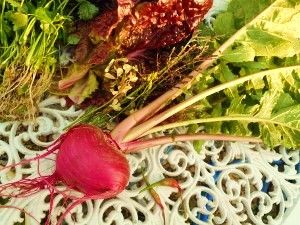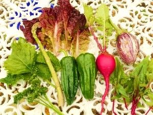 翌日も三つ葉、赤レタス、ルッコラの花、サラダ赤蕪
