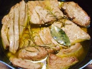 オリーブ油にニンニク、ローズマリー、ローリエを加えてコトコトっ