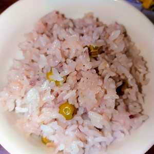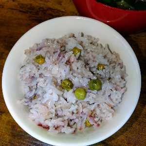 酸味を加えたら黒米ご飯同様桜色になり豆の緑色が引き立ちそう