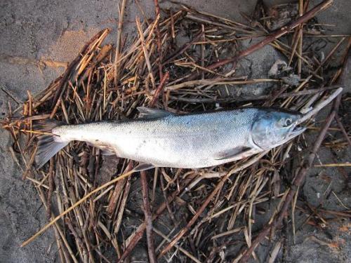 待ちにまったサケが来ました。自信も初、浜でも初の釣果です 9月は全く駄目だったので竿の最初の小さなゆれを見た時はまさかと思ったらいきなり大きなひきキターと走り合わせを入れるとガツンと重いヤッター周囲の刺さるような目線をバックにとうとうあがりました。一本で終わりましたが考えて作った仕掛けに来たのは嬉しいうれしい一本です。群れが岸寄りようになれば期待できると思います頑張ります。