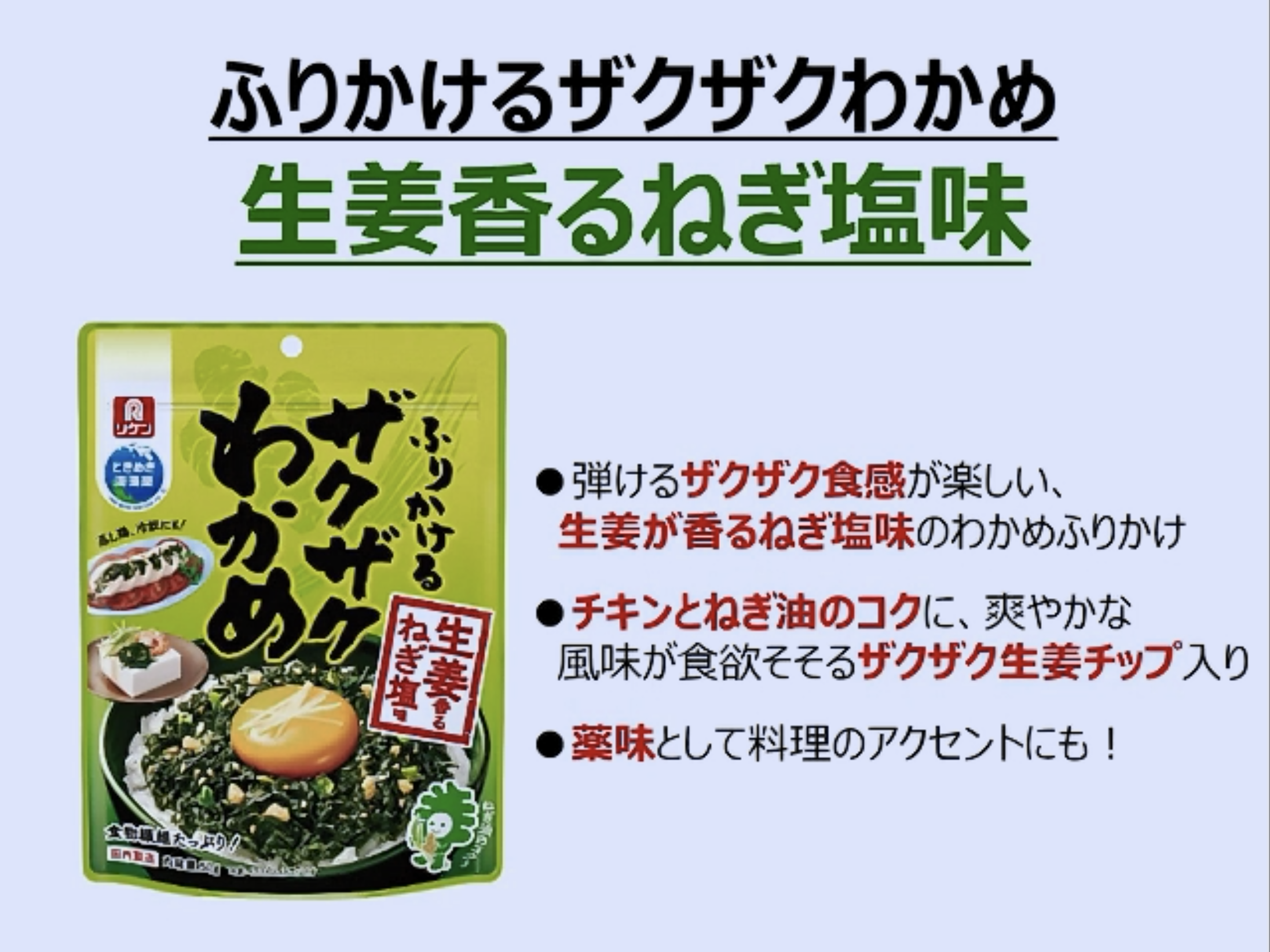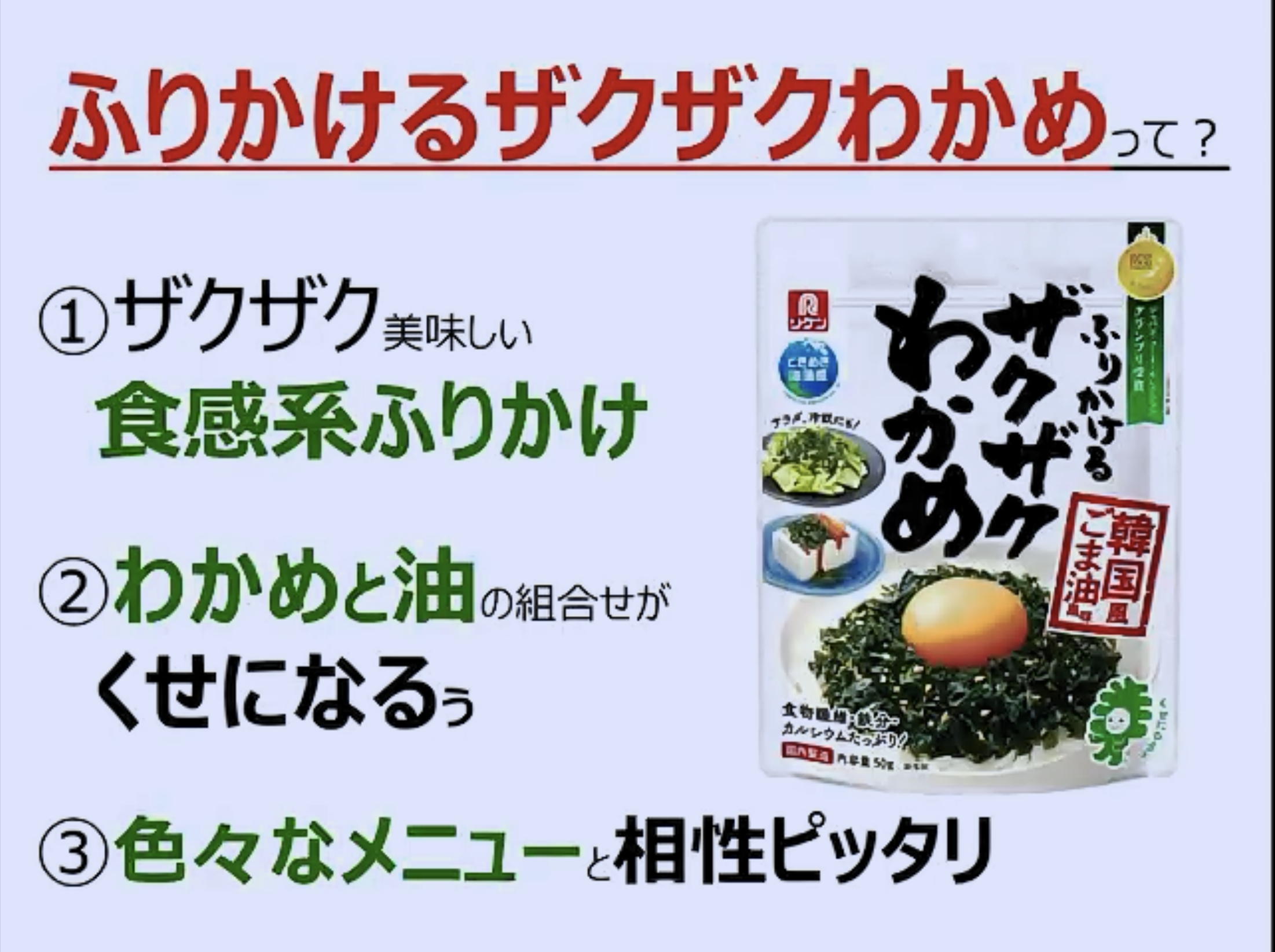 「ふりかけるザクザクわかめ」は、ザクザクとした食感が美味しいわかめのふりかけで、色々なメニューと相性が良いです。
