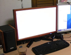 ついに買いましたNew液晶!今まで使っていたのがIOの安物と発色はいいけど反応速度がいまいちなEIZOモニターデュアルでしたが~ついに!買い換えましたよーEIZOの方は色がいいのでそのままですがIOの位置にacerのG24oid(オレンジ!)を導入です><Acer G24oidさすがに50000:1のコントラスト比は嘘っぽいですがそれをうたっているだけあって黒なんかが引き締まって綺麗です。結構明るい液晶で私は少し輝度なんかを下げてつかってます反応速度ですが遅延は特に感じられません。まだ使って間もないのでなんともいえませんが映画や360をやっていて特に気になる遅延は見られませんでした。ただ気になるのは視野角ですかね、さすがTNといったところで角度をつけてみると色が黒っぽく変わっちゃいます。それでも正面や寝転がってやる分には問題ないぐらいです。真横から画面見るわけでもありませんしw不満といえばー設定ボタンです。使いにくいですねw慣れれば問題ないといえばなさそうですが、切り替えなんかするときがややっこしいのと付属のディスプレイドライバーを入れると縦に設定したEIZOとG24を誤認?再起動するたびに解像度と角度がめちゃくちゃになるため入れることができません。ショップなんか弄るならEIZOとか三菱とかのいいのVA買えよといわれそうですが予算とゲームをする私にはこれが最大限の背伸びでしたorz全体的な感想としては、私は初20インチ以上のモニターなので正直でかさにびっくりしました~戦争ゲームなんかやってても遅延が少ないので見やすいし映画とかアニメとかを大画面で見たときは結構ため息ものでした。もっと安い24インチもあるけど。HDMIが微妙だ~とかいろいろ聞いてるとこれになっちゃいましたがいい買い物だったかな?w今年360で発売のスターオーシャンやバイオ5が楽しみになってきたよ!!しばらくしたらまたどんな様子か書こうと思います。暇でしたらまたどうぞー