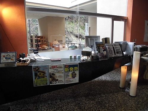 新年度の初登館の日、今年度もたくさんの来館者をお招きする受付カウンターです。何でも、28年度の入館は、18千人を何とか超えることができた、と・・・。新年度は、開館して20年になる節目の年ですから、さらに多くの皆様のお出でを期待したいと思います。 エントランスホールから玄関を見たところです。ガラス越しに見る外のようすも、だいぶ春めいてきています。ここで、左端にご注目ください。 そうです。金山博物館のシンボル的存在の1つの、金魚ちゃんたち。その水槽がとてもきれいになっています。ご来館の際は、ぜひ金魚ちゃんたちにも、ご声援をお願いいたします。