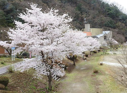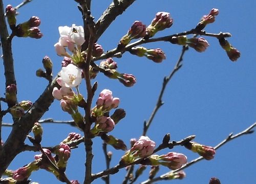 金山博物館の脇を流れる下部川、昔の堤防の土手のような部分に植栽されているソメイヨシノに、ちらほらと開花するものが見られてきました。もうすぐですね、満開のサクラの春・・・。