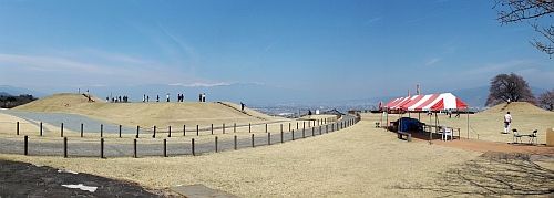 今日は水曜日。博物館は休館です。 さて、比較的よい天気に恵まれたので、少しの時間、笛吹市は八代町岡にあるふるさと公園を訪ねました。 ここは、古墳時代前期の本県有数の前方後円墳である県史跡・岡銚子塚古墳が見どころ(画面左側)です。右手奥に杯塚古墳もありまして、見晴らしもよく、古代の雰囲気を堪能できるところです。 杯塚古墳の向こう側には、大きな桜の木があって、いま3~4部咲きといったところでした。