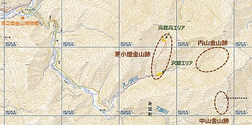前回の記事の茅小屋金山遺跡の探査について、位置関係をご理解いただくために作成したマップをアップしました。