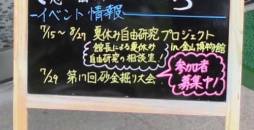 前回の記事をアップした後で思い出したことですが、そのウエルカムボードの下の方に、金山博物館の夏休み向けイベントの一部の告知が見られました。 初めの方の「夏休み自由研究プロジェクトin金山博物館」について、昨日、地元紙である山梨日日新聞の支局の記者さんの取材をお受けしました。どんなお話なのか、記事が出たらご紹介しますね。お楽しみに・・・。