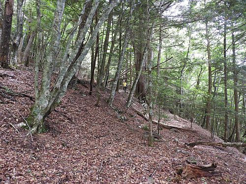 今日(7月2日)は、朝も早よから金山博物館に集合・出発して、茅小屋金山遺跡の調査に向かい、茅小屋金山の跡の調査課題の克服に取り組みました。 課題の1つめは、採鉱区域の詳細の把握にあり、2つめには、作業区域の現状の詳細地形データの作成にありました。 これまで何度か継続的に取り組んでいるものですが、4月19日に引き続き、今年度2回目となった調査活動の概要をお知らせします。 初めに挙げた課題に迫るため、2班に分かれての調査となりましたが、まずは高標高エリアでのようすです。標高1300~1400mの山中に、いくつかの平坦地が見られます。急斜面を削平して造成されたとみられる作業ないしは生活のための場所と推定されるところですが、調査の中ではとくに、テラスと呼んでいるものです。 調査スタッフのうちのF隊員が立つところ、その横の大きな木の手前、といくつものテラスが見られます。 最初の写真の手前のテラスの山側には、崩れかけてはいますが石積みが見られます。 これらのテラスの概略はこれまで明らかになっていましたが、では、どの範囲まで続くか、その先に、採鉱域があったりはしないか、という課題がありまして、知られているテラス群のずっと下まで降りていき、調査を進めたK隊員の姿が、傾斜のきつい林地のずっと向うに見えています。そうです、金山遺跡の探査は、とてもハードなのです。 高標高エリアのテラス群から少し離れた沢地形の探査の状況です。岩の露頭が見られる場所で、採掘をした痕跡が存在しないか、をK隊員が調べているところです。 高標高エリアで活動できる時間は限られていて、下山し、沢部エリアの調査班と合流しなければということで、道があってないようなところを急ぎ下るのですが、登るもたいへんながら下りもたいへんで、ちょっと一服するところに、大きなサルノコシカケを生じさせた木があり、息抜きにそれを見入っているK隊員、またそれを見守るF隊員の姿がご覧いただけます。 標高800mちょっとの沢部エリアの調査隊に合流、一緒に撤収作業を進めました。この写真の中ほどに活動の姿をとらえたのはM隊員であります。 みんなよく頑張りました。それにしても、梅雨時は高い山の中でも蒸し暑くて、体力的にとても厳しく、とてもたいへんでしたが、これも茅小屋金山の跡を世に出していくための努めだと信じてのことでありました。終わりになりましたが、調査をリードしてくださいました K先生、いつもながらのご指導ご支援ありがとうございました。引き続きよろしくお願い申し上げます。 今回の記事では、ほんの一部をご紹介するのみとなりました。いずれまた調査のようすをお伝えする時もありましょう。ご期待ください。