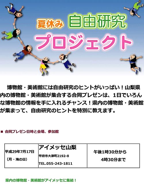 県内の美術館・博物館・資料館がたくさん集まって、子どもたちの自由研究のための合同プレゼンテーションが開催されます。 湯之奥金山博物館のブースもありますよ。砂金採り体験できます。親子そろってお出かけください。暑いので、気を付けてお出かけください。会場は涼しいという情報があります。
