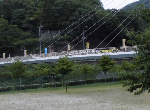 大会の開催を明日に控え、その準備も大詰めです。大会準備の一コマですが、こちらはメロディブリッジに、大会開催の告知をする横断幕を設置しているところです。 とても長い横断幕をしっかりと橋の欄干に固定しています。ちなみに、このメロディブリッジは、直近のJR身延線・下部温泉駅と金山博物館を結ぶ人道橋です。 これで、だいぶ雰囲気が出てきました。