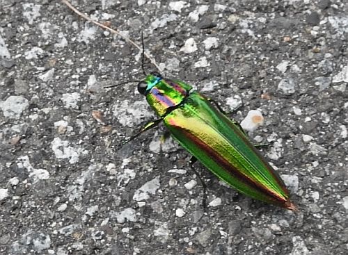本日の閉館間際のタイミングで、タマムシが見られました。 第一発見者はリーダーさん。発見場所は、博物館前の駐車場の舗装の上。発見後の対応は、強盛確保して、そのままお山の方に強制送還となりました。 でも、タマムシが生きて見られるなんて、ほんとに湯之奥金山博物館の周辺環境はいいなぁ・・・。
