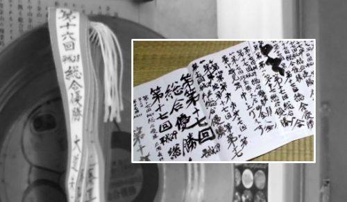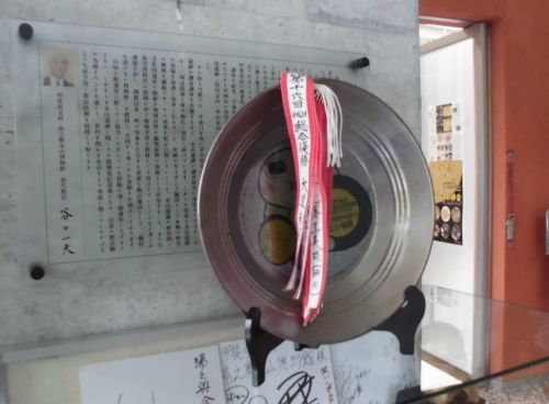 湯之奥金山博物館の玄関口正面の展示ケースの上に、いまだけ優勝カップならぬ優勝パン皿が置かれています。 数多く下がっているペナントを横にずらせて見ると、優勝パン皿の中に、さらにもん父の手にするパン皿が描かれていて、そこに優勝パン皿の授与される種目などが書き込まれているのでした。 まもなくやってくる大会(もう今週の土曜日ですよ)で、この栄誉を勝ち取るのは誰なのかなぁ~。