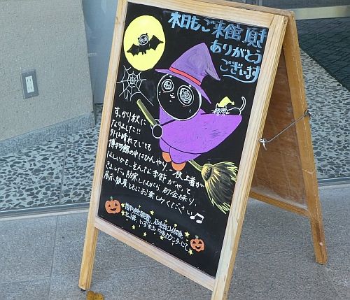 湯之奥金山博物館の正面玄関に置かれ、いつもお客様をお迎えするウェルカムボードです。季節感を大事に、頻繁に更新されています。いまは、こんな絵柄ですが、今日で書き換えになるのだと思いますよ。明日は、どんなデザインで、皆さんをお迎えするのでしょうか。たのしみです。 おっとっと、明日(2017年11月1日)は水曜日で、湯之奥金山博物館は、休館日でありました。あさって(11月2日)からご覧くださいね。