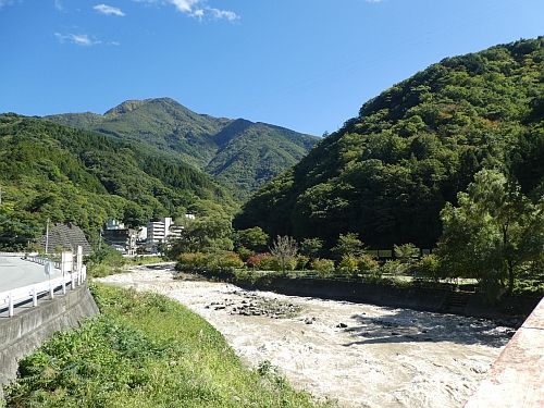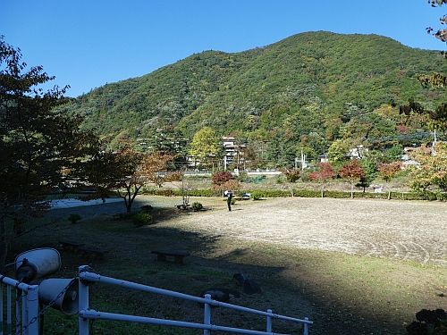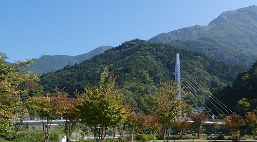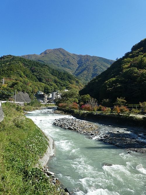 メロディー・ブリッジの上から、下部川の上流方向を見ました。台風22号の影響で水量がまた増えているようですが、前回の台風21号の時ほど水量も多くなく、濁りもおだやかです。 高く聳えるお山、五老峰は、上の方から紅葉が始まっているようです。台風が通過した後、日本列島一帯に寒気が入り込んで寒くなるという予報が聞かれました。冷え込むと一段と紅葉がくっきりしてくるでしょうね。