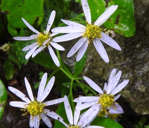 10月の雨の中で、ユウガギクの花を見ました。ユウガギクは、山野に見られる多年草で、7月から10月にかけて花をつけます。 白い、ややまばらな舌状花が特徴ですが、ここでは、日陰で成長がよくないせいか、いちだんと華奢な感じで存在しています。そのユウガキク、ここ数日の雨をうけ、雨の重みに耐えかねて横倒れになっていて、加えて白い花びらに泥はねが生じ、とてもつらそうな状況になっています。がんばれ、ユウガギク・・・。