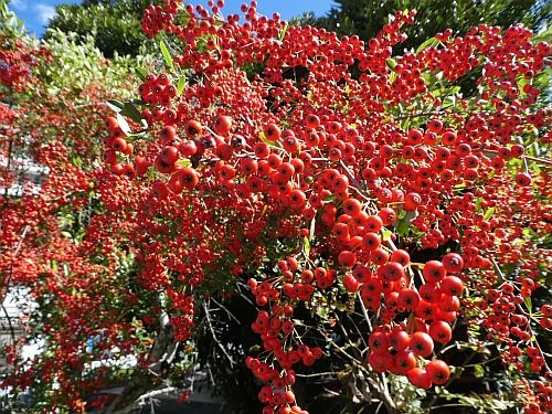 湯之奥金山博物館のゲートブリッジともいうべき温泉橋の右岸上流側のたもとに、このトキワサンザシの木がありまして、いまたくさんの実を付けています。真っ赤な色で、これはお日様の力なくしては・・・、だなと思いつつ撮影したのは、10月23日のこと。以来なかなか太陽がしっかり顔を見せてくれません。 太陽の光を十分に感じさせるトキワサンザシの実でありました。 ここでは、あえてトキワサンザシの名称を使いましたが、バラ科トキワサンザシ属の木の総称をピラカンサというそうで、一般にはこちらの名前の方が通りがいいですね。