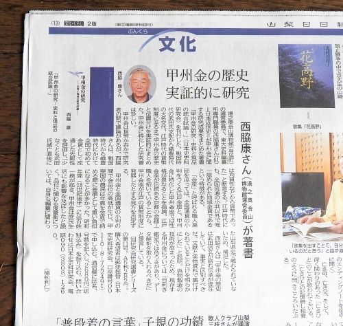 今日(2017年10月7日)の山梨日日新聞の文化欄にご紹介がありました。当館の運営委員をお願いしている西脇先生のご著書『甲州金の研究』についてです。 購読をなさっておられる方は、ぜひご一読ください。またこの新聞を目にする機会のない方は、湯之奥金山博物館のエントランスホールに掲出しますので、ご来館の際にお目とおしください。