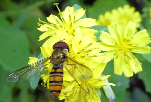 今回のタイトル、カタカナの長い名前が二つ続いたものですが、黄色の花がアキノノゲシ、そして、花に来たハナアブの名前がホソヒラタアブです。 ホソヒラタアブの顔をじっくり拝めるカットです。ハチじゃなくてアブだなとわかるものだと思われます。