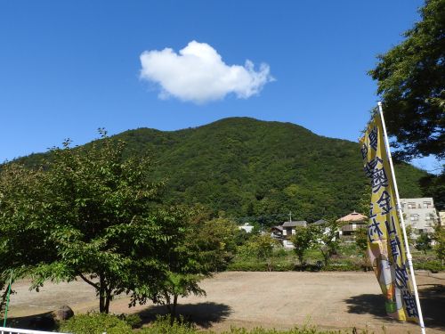 昨日(2017年10月8日)の午前11時頃、湯之奥金山博物館の北側にある醍醐山の方向を見ていたとき、よく晴れたなかで、お山の上にポッカリ、雲が浮かんでいいました。その雲どことなく「くじら雲」を連想させるものがありました。でも、ちょっと違うか・・・。次に浮かんだのは、ビートルズのイエローサブマリン。でもでも、白いから・・・。
