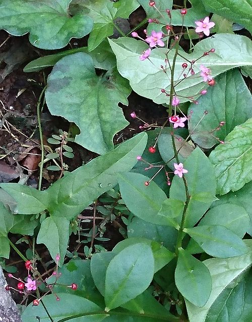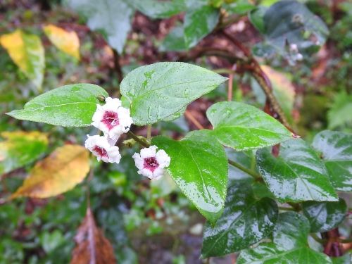 昨日はちょっと青空も見られてものの、よく雨が降る10月ですね。雨に濡れたヘクソカズラの花が見られました。ふつうヘクソカズラの花は、8~9月で、9月になれば、実も見られるようになり、そのようすは以前にこのブログでも取り上げています。9月25日の「黄金の実なる」です。 さらにクローズアップした状況。白い花は先が浅く5裂して外側に反り返ります。内側が濃い赤紫で5角形に見え、白い毛と長いしべが除きます。 なお、白い花が先が5裂というのが基本的ですが、まれに4裂するのや6裂するものも見られます。四つ葉のクローバー的で、そういうの見たときは、ちょっといい感じになります。