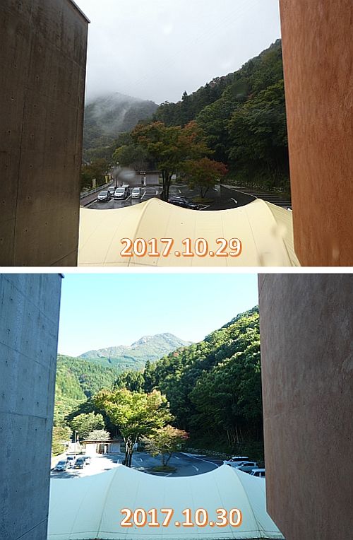 湯之奥金山博物館の展示室の出口部分に大きな窓がありますが、そこからの眺めで、昨日(2017年10月29日)と今日の比較を試みました。台風が接近中と、過ぎ去った、即ち台風一過の光景の見比べです。
