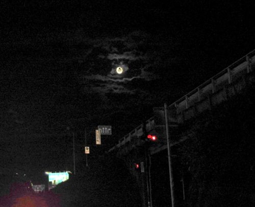 国道20号中小河原立体の側道で信号待ち中、正面にぼんやりお月さま。中秋の名月です。 今日は、旧暦の8月15日。十五夜さんですが、甲府盆地一帯では、雲が多く、雲間に見えるお月見となりそうです。