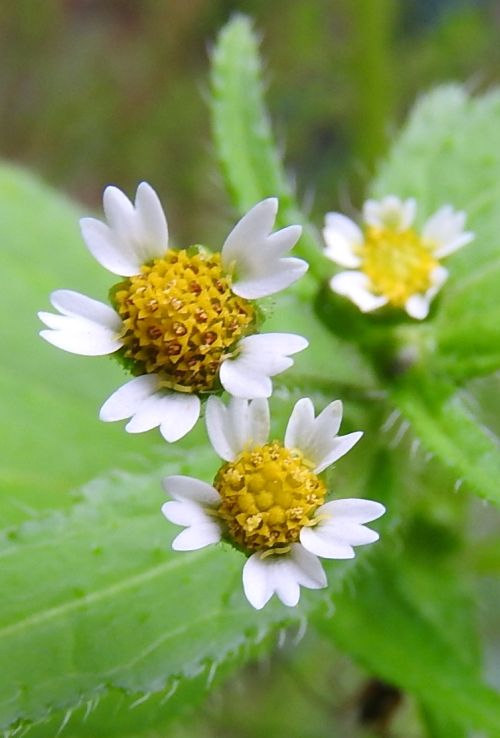 湯之奥金山博物館の通用口脇に咲くハキダメギクの花です。わが国にはもともと見られなかった植物ですが、いまでは各地の道ばたや荒れ地などで見られます。 とても小さな花で、キク科の植物に共通の作りではありますが、さらに小さな花の集合体になっていて、花の周辺部には白い花びらをもつ舌状花が5つ見られ、内側には黄色の筒状花が密集しています。 その筒状花ですが、画面下側の花を見ると外側から順次咲いていくことがわかります。この傾向は、ヒマワリなどの大きな花では確認しやすいですが、こんな小さな花でも共通ですね。