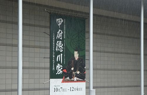 今日も雨になりました。午前に訪れた県立博物館ですが、開催中の企画展の告知バナーを撮影したのですが、降りしきる細かな雨が写り込んでいました。