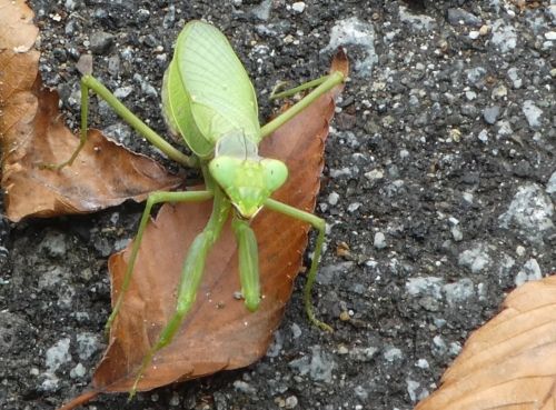 博物館の前庭の隅、枯れ葉が吹き寄せられ、折からの雨にしめっているところにカマキリがいまして、カメラを向けると、カマ(前肢)を構えて、キッとにらんできました。 今回の個体は、カマキリの中でも、ちょっと太めのハバビロカマキリと思われるものでした。
