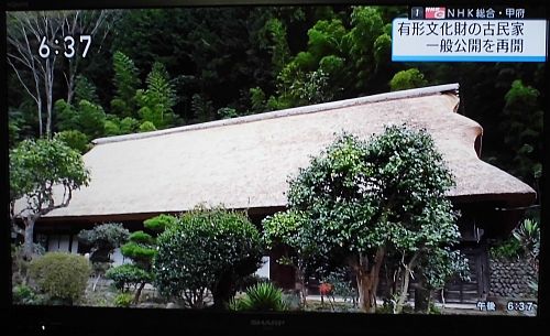 今夕の NHK-TVのローカル・ニュースの中で、身延町和田にある県指定文化財の旧市川家住宅の茅葺き屋根の葺き替えを中心とする保存修理工事が本年6月より行われて来たのが、このほど完了し、公開が再開された・・・との話題が報じられました。 茅葺き屋根の妻側の構造が、屋根裏に光を取り入れる工夫から、「かぶと造り」と呼ばれているところが見どころである・・・とか、 保存建物の内部には、民俗資料も展示されているなどの解説がありました。最後に、この事業を担った身延町教育委員会の文化財担当リーダーが、屋根の修理が終わり、この地域の歴史を伝えるこの建物が一段の美しく整ったのでぜひ見に来てください、と呼びかけをされていました。 湯之奥金山博物館から自動車で15分くらいの所です。博物館の見学に合わせ、足を伸ばしてみてください。金山博物館に、この旧市川家住宅の案内パンフレットも置いてありますので、それを手にして行きましょう。
