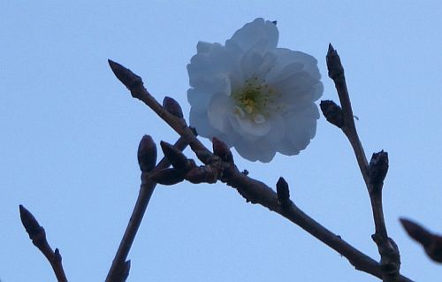 そろそろかな、あっ、咲いてた・・・。 八重咲きのサクラ、この10月から咲き始めます。 そのサクラの木の全体ですが、この夏から葉が極端に少なくなってしまい、枯れちゃうのかな、と心配していたのですが、数輪花が開き、まだ蕾もいくつか見られるので、この秋から冬を通して楽しませてくれると思われます。 桜の名前は難しいのですが、十月桜というのに当たるのか、四季桜というのもありまして、どういうんだろうと悩みます。そういえば、昨年の今頃もこのサクラの記事をのこしていました。ご参照ください。