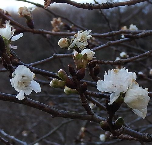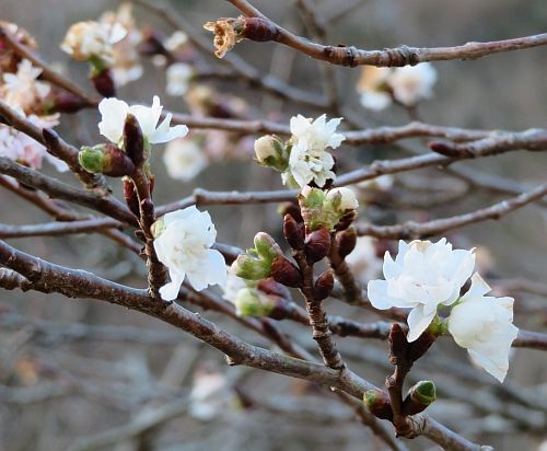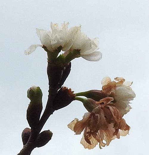 花開いていく早さと、花が凍って枯死してしまう早さと、どちらが早いかみたいな状況になっています。咲いても直ぐに凍結により枯れてしまうものが多くなっています。 条件が恵まれた部分での十月桜の花は、ご覧のように八重咲きの白い花が、うまく開いています。このまま数日間、咲き続けることができれば、もっと色が濃くピンクの花に変わっていくのですが…。 またすぐにやって来る氷点下の気温で、ダメになってしまう。直ぐに枯れるために咲く花という感じで、ちょっとかわいそうです。 が、それでも一時、花を見せてくれるその力に勇気づけられる感じもします。