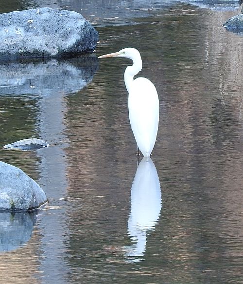 前々々回の記事で、カルガモをご紹介しましたが、その場所で、1月7日のお昼頃、こちらの大きな白い鳥、ダイサギが見られました。 最初の写真の後、くちばしを流れにつけて再び反対の方向に顔を上げた瞬間で、くちばしの先端にしずくがたれようとしていました。ちょっと迫力を感じたダイサギでありました。 なお、この後は、下部川の北側にある大きなホテルの敷地内の松の木に飛んでいき、そこにしばらくとどまっているようでした。