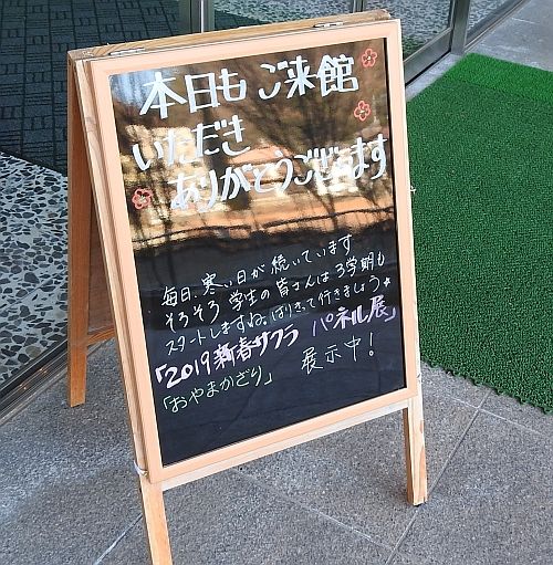 今年初めての連休、土曜日もお休みだった方には3連休となりましたが、今日はその最終日、月曜でしたが「成人の日」の祝日でありました。 そんな日のお昼前、湯之奥金山博物館の正面玄関前のようすを見ました。外側が寒く、館内が比較して暖まっているので、ガラス壁面やドアのガラスに結露で曇る状況が出ていました。そして、肝心のウェルカム・ボードですが、さらに近づいて見ると…。 梅の小枝にウグイスならぬメジロが描かれています。梅とウグイスなら、正月などに遊ぶ花札の二月の札の絵柄ですが、当館の周辺では、どちらかといえば、メジロがよく目にされます。それにしても、本格的な春が待ち遠しいですね。