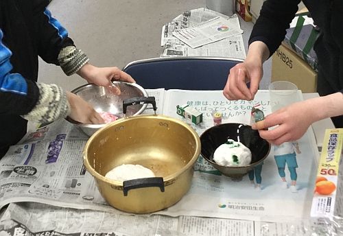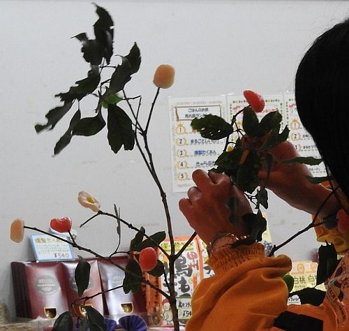 団子花用の団子づくりがはじまりました。通常開館の一方で、お客さま対応の隙間をぬっての忙しい業のはじまりでした。 練り上げた米粉に食用着色剤で色付けしながら、丸い団子を基本としながらも、いろんな形が作られていきました。 それを電気コンロの上にのせたカセットコンロを使って蒸し上げます。 そのころ、外ではこんな作業も・・・。今回もお山作りと同様に、博物館応援団の有志の方など、お手伝いをいただいておりました。ご支援感謝申し上げます。 外であらかたの調整をされた枝に、団子を飾っていきます。