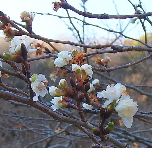 今日(1月5日)の十月桜の全体像です。小さな白い花がたくさんついているのがわかります。盛んに咲いていた昨秋11月頃と比べて、だいぶ花が小さい感じです。なぜだろう・・・。 いまの時期はとても冷え込みが厳しく、前回の記事にサザンカの花の場合についてお伝えしておりますが、この十月桜の場合も例外ではなく、つぼみが開いて、白い八重の花が開き始めたかどうかという時点で、凍害を受けてしまい、それ以上成長しないので、花の大きさもふくらまないですし、色も時間を経て薄いピンクから濃いめのピンクへと移ることもなくなってしまっています。 だから白い小さな花とつぼみと、それに凍って褐色に枯れたものだけになってしまっているので、いまはあまり鑑賞に堪えない状況であります。