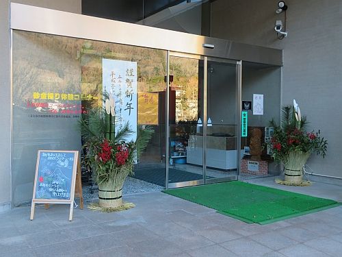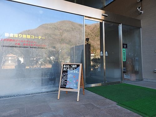 今日、1月2日は水曜日、ですが、湯之奥金山博物館は特別開館をしております。 博物館の正面玄関前の定番のウェルカム・ボードも、お正月モードとなっています。 博物館前の駐車スペースも、県外ナンバーのお車を中心に賑わいを見せております。